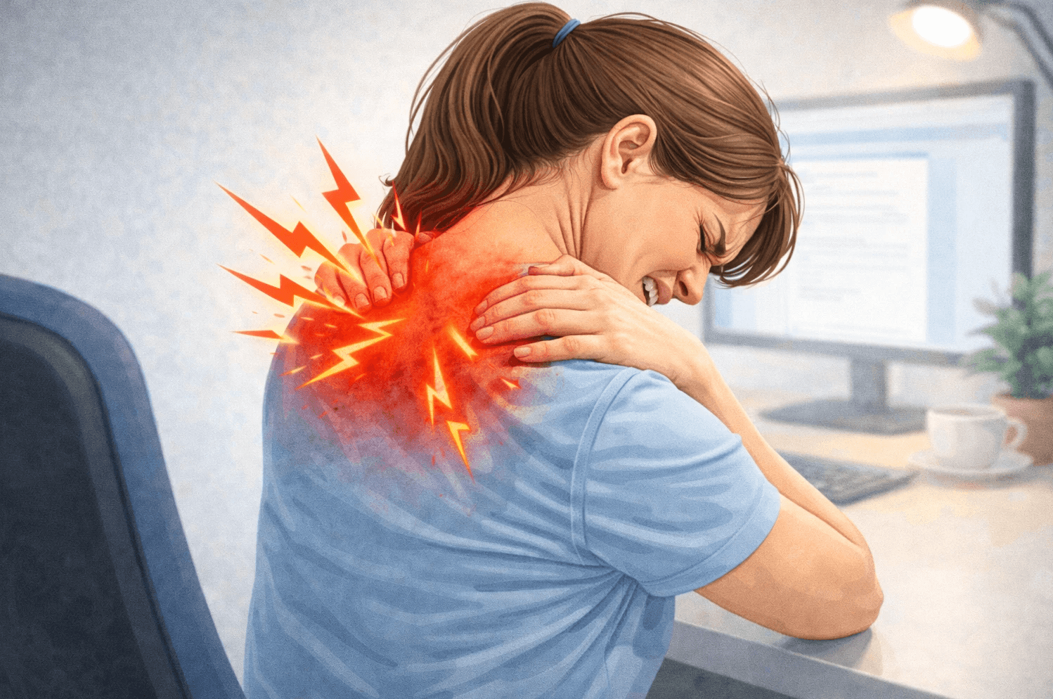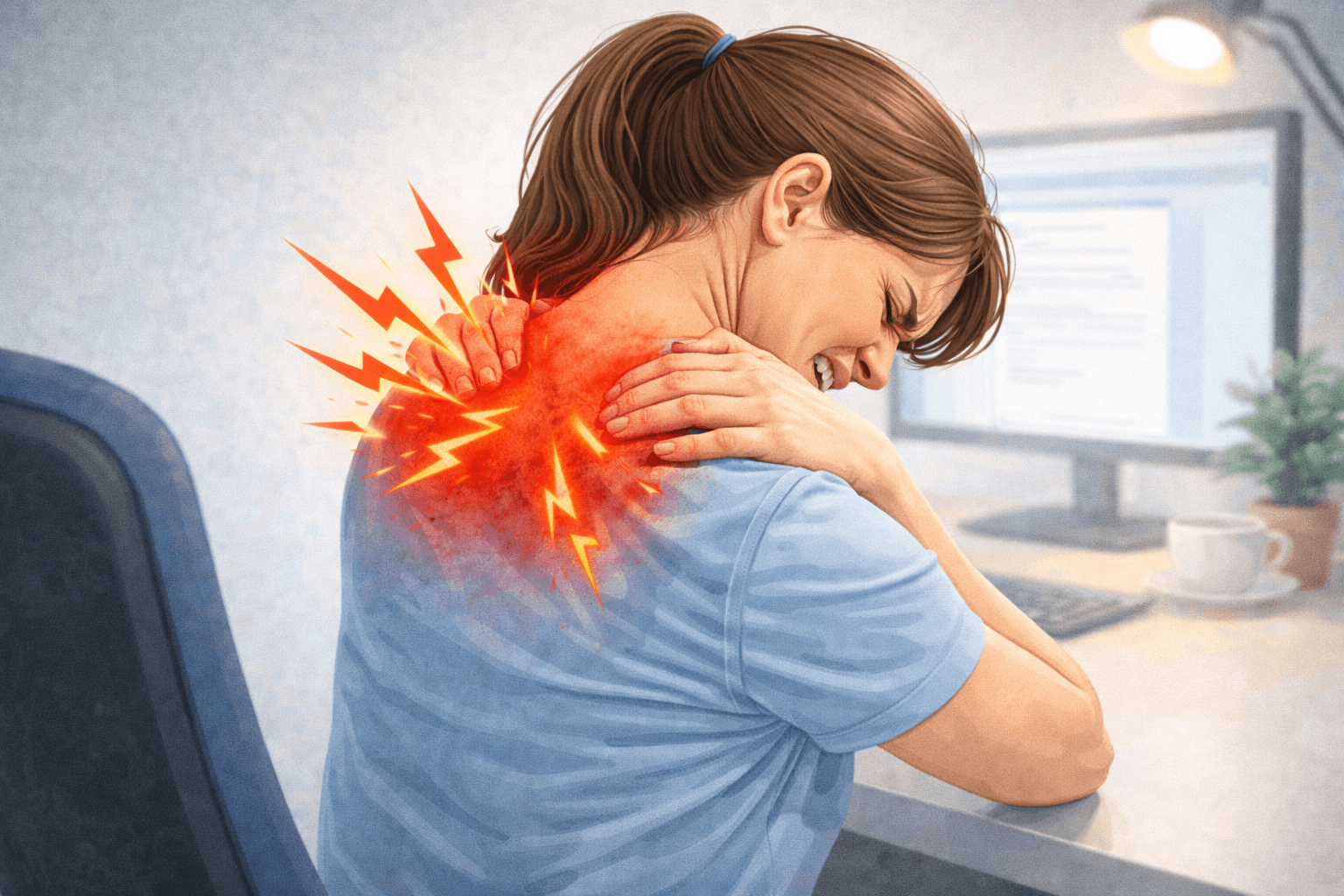 בקליניקה טיפלנו באישה בת 36, עובדת הייטק, שסבלה מכאבים בין השכמות שהחמירו במהלך יום העבודה.