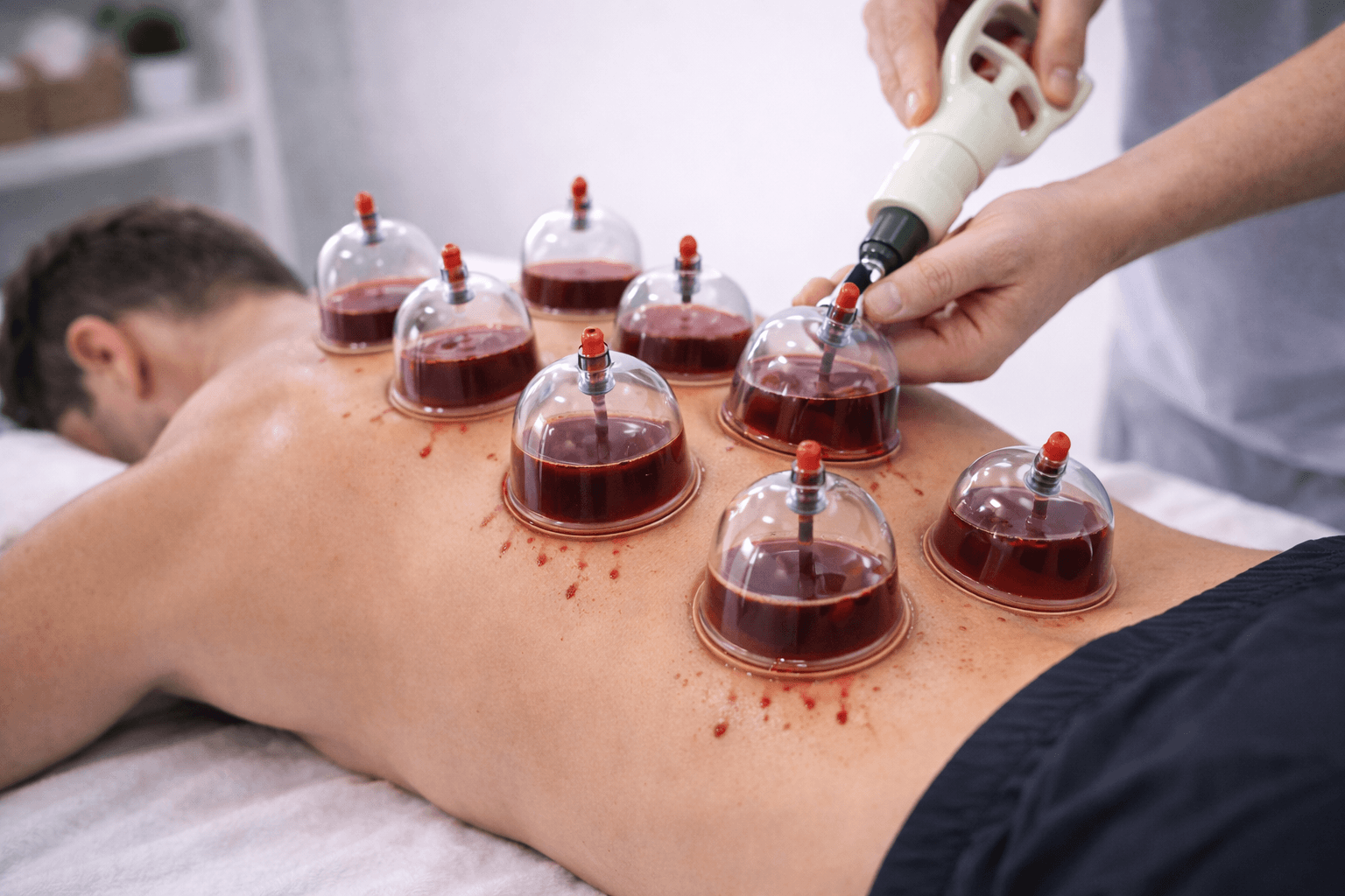 כוסות רוח עם הקזה – שילוב של כוסות רוח ולחץ שלילי, אחרי פציעה שטחית מבוקרת של העור.